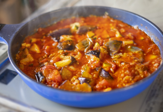 05ズッキーニのくり抜いた部分も加え、しばらく煮込んで馴染ませます。